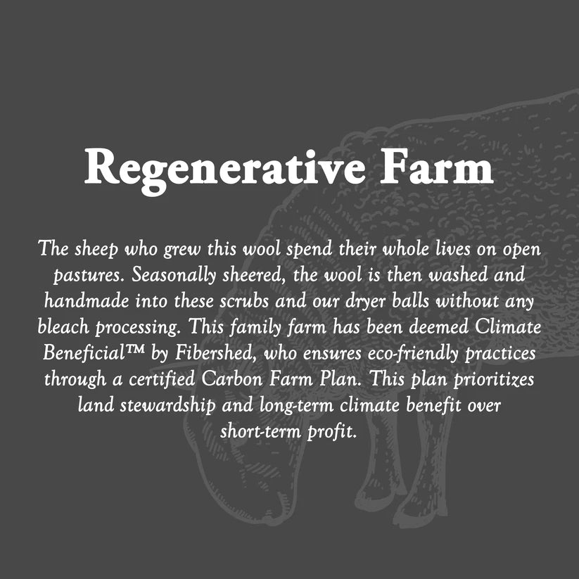 Regenerative Farm | The sheep who grew this wool spend their whole lives on open pastures. Seasonally sheared, the wool is then washed and handmade into these scrubs and our dryer balls without any bleach processing. This family farm has been deemed Climate Beneficial™ by Fibershed, which ensures eco-friendly practices through a certified Carbon Farm Plan. This plan prioritizes land stewardship and long-term climate benefits over short-term profit.